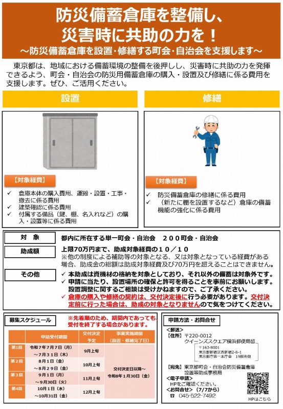 東京都では今年度、町会・自治会で設置する防災備蓄倉庫設置等助成を行っています。