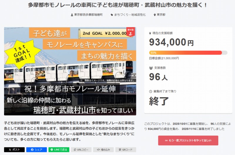 多摩都市モノレールのクラウドファンディング 2025-11-16 に 井上かずや公式ホームページ が投稿 — コメントを残す 町ではクラウドファンディングを実施していたのですが、とても素敵な結果となったようですね! 多摩都市モノレール車体への「まちの魅力」ラッピング事業のための「クラウドファンディング」について(クラウドファンディングは終了しました) 画像は株式会社CAMPFIRE特設ページより多摩都市モノレールの車両に子ども達が瑞穂町・武蔵村山市の魅力を描く!