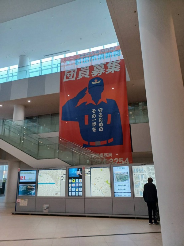 町田市を訪問 2025-11-20 に 井上かずや公式ホームページ が投稿 — コメントを残す 行政計画策定の関連で、町田市を訪問させていただきました。未来づくり研究所なる部署があるなんて、町田市、すごい!!さすが、43万人の大都市です! 市役所内には消防団員募集のタペストリーが。3階から2階にまたがるタペストリーで、見せ方も工夫されています。 市役所の屋上からは、素敵な風景が眺めらます。個人的には、富士山が見えないのが残念でした。
